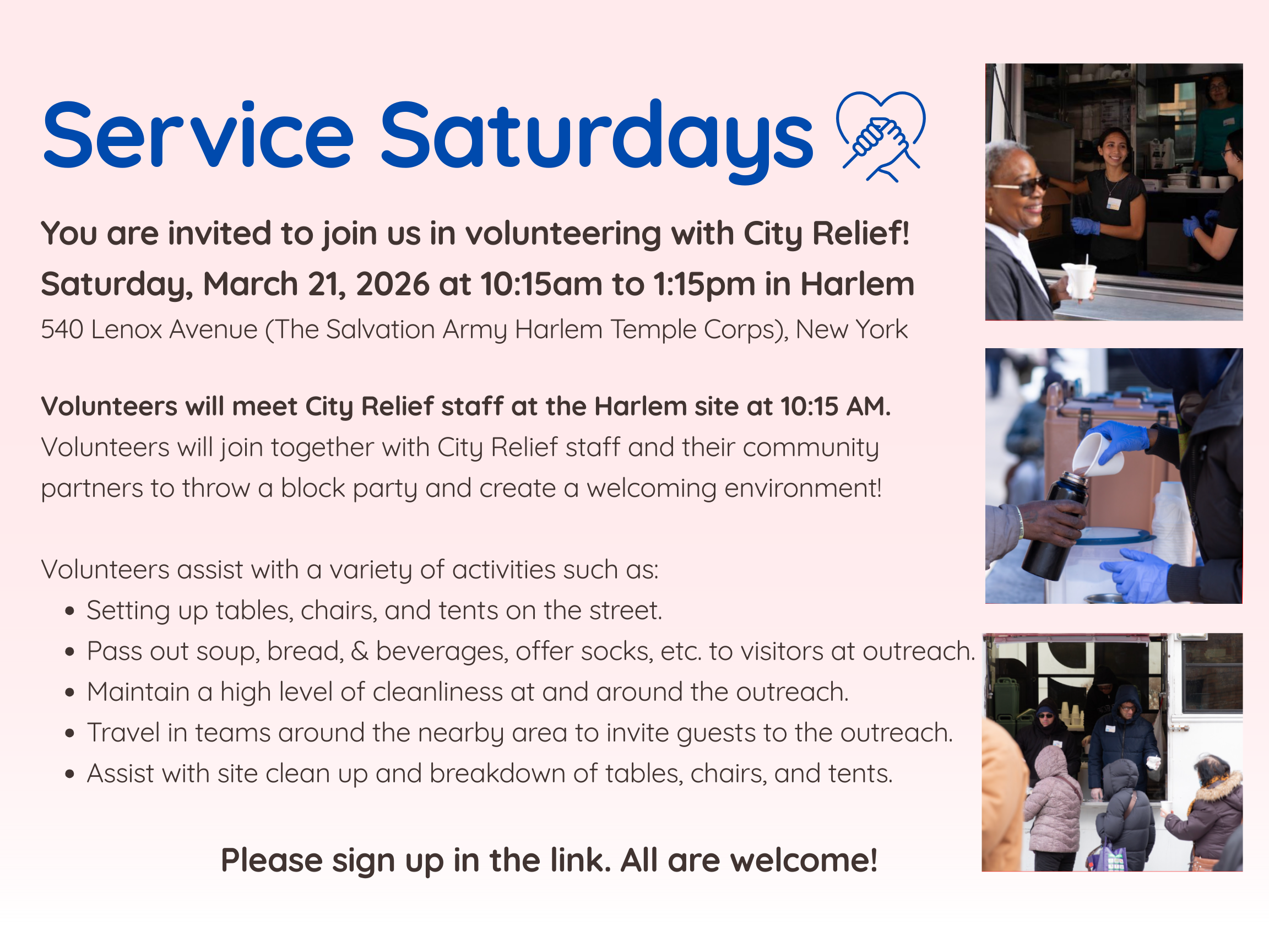 Volunteers will meet City Relief staff at the Harlem site at 10:15 AM.
